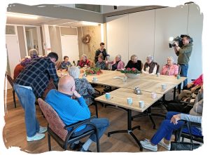 Met ruim 25 bezoekers werd het een vrolijke boel: camera, microfoon, interviews, gelach… en vooral héél veel taart. Er werd gefilmd, gekletst en geproost op het leven én op Omroep Gelderland.